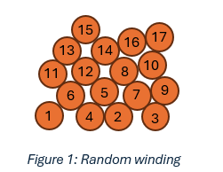 In random winding, magnet wire is wound in a disordered, scrambled pattern. This method is the lowest cost and fastest for large volume production of high-turn coils. The random nature of this technique can create areas of high voltage stress so it should be reserved for lower voltage applications.