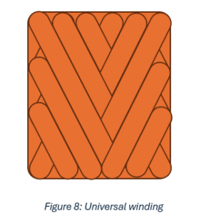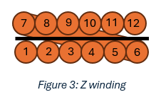 In Z-Winding, magnet wire is wound in layers with each layer stacked on top of the previous one, but at the end of each layer, the wire is dragged back to its initial starting position before proceeding. This forms a Z-shaped pattern and reduces capacitance and voltage stress by limiting the maximum electric field that can develop between layers. Layer insulation can be added between layers.